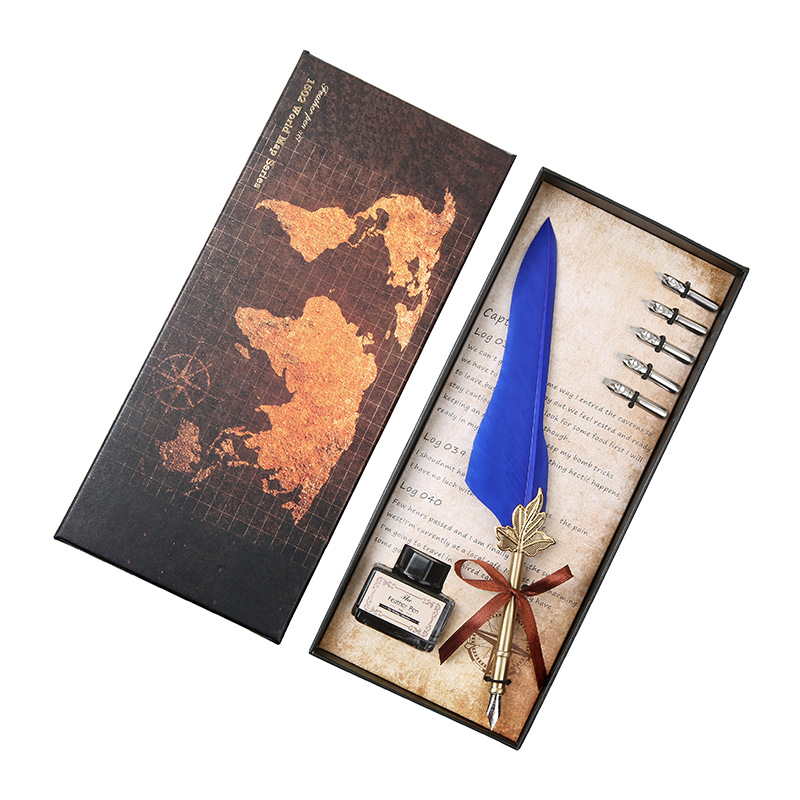 Fjäderpenna, flytande bläck, 5 stycken skrivhuvuden, förpackade i ett fint etui.